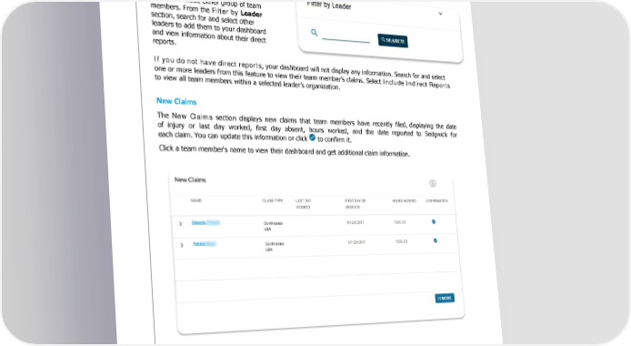 for Disability and Leave of Absence Claims Filter by Leader Leaders with team members who report both directly and indirectly to them can filter and include either group of team members. From the Filter by Leader section, search for and select other leaders to add them to your dashboard and view information about their direct reports. If you do not have direct reports, your dashboard will not display any information. Search for and select one or more leaders from this feature to view their team member's claims. Select Include Indirect Reports to view all team members within a selected leader’s organization. New Claims The New Claims section displays new claims that team members have recently filed, displaying the date of injury or last day worked, first day absent, hours worked, and the date reported to Sedgwick for each claim. You can update this information or click to confirm it. Click a team member's name to view their dashboard and get additional claim information. Sedgwick Copyright © 2019 The information contained herein is confidential and proprietary to Sedgwick. Last Updated March 21, 2019 -2-