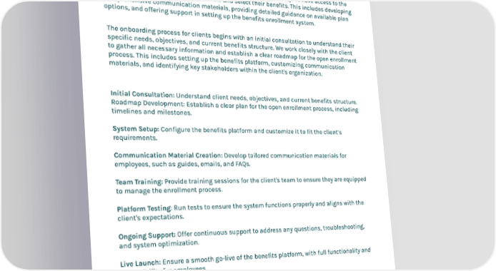Open Enrollment The open enrollment process is designed to ensure that all employees have access to the necessary tools and resources to review and select their benefits. This includes developing comprehensive communication materials, providing detailed guidance on available plan options, and offering support in setting up the benefits enrollment system. The onboarding process for clients begins with an initial consultation to understand their specific needs, objectives, and current benefits structure. We work closely with the client to gather all necessary information and establish a clear roadmap for the open enrollment process. This includes setting up the benefits platform, customizing communication materials, and identifying key stakeholders within the client's organization. Initial Consultation: Understand client needs, objectives, and current benefits structure. Roadmap Development: Establish a clear plan for the open enrollment process, including timelines and milestones. System Setup: Configure the benefits platform and customize it to fit the client’s requirements. Communication Material Creation: Develop tailored communication materials for employees, such as guides, emails, and FAQs. Team Training: Provide training sessions for the client's team to ensure they are equipped to manage the enrollment process. Platform Testing: Run tests to ensure the system functions properly and aligns with the client's expectations. Ongoing Support: Offer continuous support to address any questions, troubleshooting, and system optimization. Live Launch: Ensure a smooth go-live of the benefits platform, with full functionality and accessibility for employees.