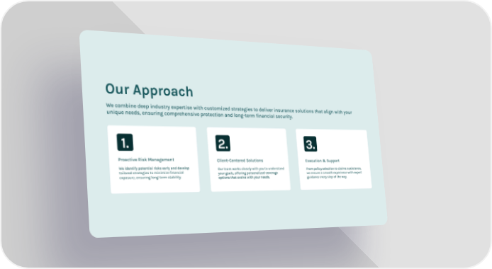 Proactive Risk Management 1. 2. 3. Execution & Support Client-Centered Solutions We identify potential risks early and develop tailored strategies to minimize financial exposure, ensuring long-term stability. From policy selection to claims assistance, we ensure a smooth experience with expert guidance every step of the way. Our team works closely with you to understand your goals, offering personalized coverage options that evolve with your needs. Our Approach We combine deep industry expertise with customized strategies to deliver insurance solutions that align with your unique needs, ensuring comprehensive protection and long-term financial security.