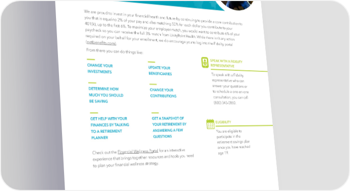 | 34 | We are proud to invest in your financial health and future by continuing to provide a core contribution to you that is equal to 2% of your pay and also matching 50% for each dollar you contribute to your 401(k), up to the first 6%. To maximize your employer match, you would want to contribute 6% of your paycheck so you can receive the full 3% match from UnityPoint Health. While there isn’t any action required on your behalf for your enrollment, we do encourage you to log into the Fidelity portal (netbenefits.com). From there you can do things like: CHANGE YOUR INVESTMENTS UPDATE YOUR BENEFICIARIES DETERMINE HOW MUCH YOU SHOULD BE SAVING CHANGE YOUR CONTRIBUTIONS GET HELP WITH YOUR FINANCES BY TALKING TO A RETIREMENT PLANNER GET A SNAPSHOT OF YOUR RETIREMENT BY ANSWERING A FEW QUESTIONS Check out the Financial Wellness Portal for an interactive experience that brings together resources and tools you need to plan your financial wellness strategy. Retirement Savings and Financial Wellness SPEAK WITH A FIDELITY REPRESENTATIVE To speak with a Fidelity representative who can answer your questions or to schedule a one-on-one consultation, you can call (800) 343-0860. ELIGIBILITY You are eligible to participate in the retirement savings plan once you have reached age 19.