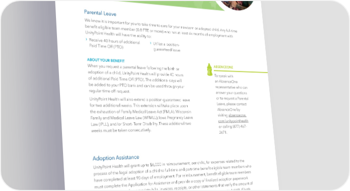 | 37 | Parental Leave & Adoption Assistance Parental Leave We know it is important for you to take time to care for your newborn or adopted child. Any full-time benefit eligible team member (0.8 FTE or more) who has at least six months of employment with UnityPoint Health will have the ability to: › Receive 40 hours of additional Paid Time Off (PTO) › Utilize a position- guaranteed leave ABOUT YOUR BENEFIT When you request a parental leave following the birth or adoption of a child, UnityPoint Health will provide 40 hours of additional Paid Time Off (PTO). The additional days will be added to your PTO bank and can be used through your regular time off request. UnityPoint Health will also extend a position-guaranteed leave for two additional weeks. This extension will take place upon the exhaustion of Family Medical Leave Act (FMLA), Wisconsin Family and Medical Leave Law (WFMLL), Iowa Pregnancy Leave Law (IPLL), and/or Short- Term Disability. These additional two weeks must be taken consecutively. ABSENCEONE To speak with an AbsenceOne representative who can answer your questions or to request a Parental Leave, please contact AbsenceOne by visiting absenceone. com/unitypointhealth or calling (877) 467- 2671. Adoption Assistance UnityPoint Health will grant up to $6,000 in reimbursement, per child, for expenses related to the process of the legal adoption of a child to full-time and part-time benefit eligible team members who have completed at least 90 days of employment. For reimbursement, benefit eligible team members must complete the Application for Assistance and provide a copy of finalized adoption paperwork along with copies of appropriate bills, invoices, receipts, or other statements that verify the amount of adoption assistance being requested. This is done by submitting a case in Lawson to AskHR. If both parents work for UnityPoint Health, the total amount of reimbursement per legal adoption of a child is up to $6,000 per child.