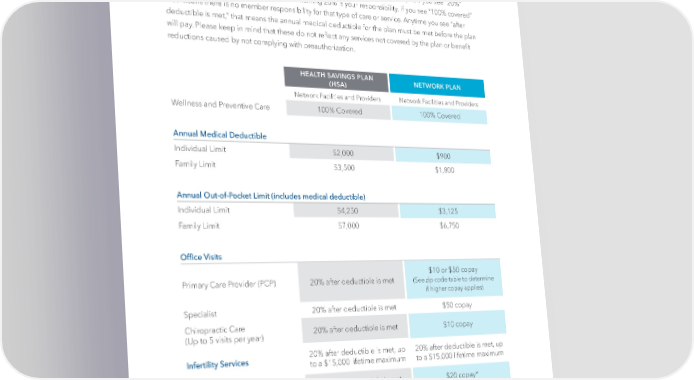 | 8 | Health Insurance, continued Compare Health Insurance Plans, continued The percentages in the following table are the percentages you pay. For example, if you see “20%” that means the plan pays 80% and the remaining 20% is your responsibility. If you see “100% covered” that means there is no member responsibility for that type of care or service. Anytime you see “after deductible is met,” that means the annual medical deductible for the plan must be met before the plan will pay. Please keep in mind that these do not reflect any services not covered by the plan or benefit reductions caused by not complying with preauthorization. HEALTH SAVINGS PLAN (HSA) NETWORK PLAN Network Facilities and Providers Network Facilities and Providers Wellness and Preventive Care 100% Covered 100% Covered Annual Medical Deductible Individual Limit $2,000 $900 Family Limit $3,500 $1,800 Annual Out-of-Pocket Limit (includes medical deductible) Individual Limit $4,250 $3,125 Family Limit $7,000 $6,750 Office Visits Primary Care Provider (PCP) 20% after deductible is met $10 or $50 copay (See zip code table to determine if higher copay applies) Specialist 20% after deductible is met $50 copay Chiropractic Care (Up to 5 visits per year) 20% after deductible is met $10 copay Infertility Services 20% after deductible is met, up to a $15,000 lifetime maximum 20% after deductible is met, up to a $15,000 lifetime maximum Urgent Care 20% after deductible is met $20 copay* Emergency Room Services 20% after deductible is met 1-3 visits: $150 copay, then 20% after deductible is met 4-5 visits: $400 copay, then 30% after deductible is met 6 or more visits: $600 copay, then 40% after deductible is met * Primary Care Provider (PCP) copay may apply at some locations if not able to bill as urgent care.