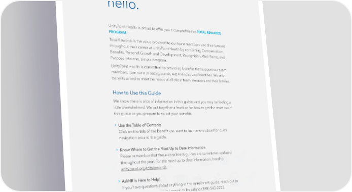 | 1 | hello. UnityPoint Health is proud to offer you a comprehensive TOTAL REWARDS PROGRAM. Total Rewards is the value provided to our team members and their families throughout their career at UnityPoint Health by combining Compensation, Benefits, Personal Growth and Development, Recognition, Well-Being, and Purpose into one, simple program. UnityPoint Health is committed to providing benefits that support our team members from various backgrounds, experiences, and identities. We offer benefits aimed to meet the needs of all of our team members and their families. How to Use this Guide We know there is a lot of information in this guide, and you may be feeling a little overwhelmed. We put together a few tips for how to get the most out of this guide as you prepare to select your benefits. › Use the Table of Contents Click on the title of the benefit you want to learn more about for quick navigation around the guide. › Know Where to Get the Most Up to Date Information Please remember that these enrollment guides are sometimes updated throughout the year. For the most up to date information, head to unitypoint.org/totalrewards. › AskHR is Here to Help! If you have questions about anything in the enrollment guide, reach out to AskHR by creating a case in Lawson or by calling (888) 543-2275.