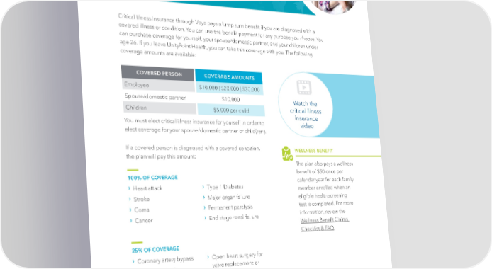 | 25 | Critical Illness Insurance COVERED PERSON COVERAGE AMOUNTS Employee $10,000 | $20,000 | $30,000 Spouse/domestic partner $10,000 Children $5,000 per child You must elect critical illness insurance for yourself in order to elect coverage for your spouse/domestic partner or child(ren). Watch the critical illness insurance video Critical Illness Insurance through Voya pays a lump sum benefit if you are diagnosed with a covered illness or condition. You can use the benefit payment for any purpose you choose. You can purchase coverage for yourself, your spouse/domestic partner, and your children under age 26. If you leave UnityPoint Health, you can take this coverage with you. The following coverage amounts are available: WELLNESS BENEFIT The plan also pays a wellness benefit of $50 once per calendar year for each family member enrolled when an eligible health screening test is completed. For more information, review the Wellness Benefit Claims Checklist & FAQ. If a covered person is diagnosed with a covered condition, the plan will pay this amount: 100% OF COVERAGE › Heart attack › Stroke › Coma › Cancer › Type 1 Diabetes › Major organ failure › Permanent paralysis › End stage renal failure 25% OF COVERAGE › Coronary artery bypass › Carcinoma in situ › Open heart surgery for valve replacement or repair 10% OF COVERAGE › Skin cancer › Transcatheter heart valve replacement or repair