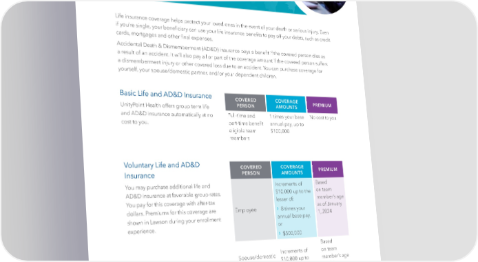 | 22 | Life and Accidental Death & Dismemberment Insurance Life insurance coverage helps protect your loved ones in the event of your death or serious injury. Even if you’re single, your beneficiary can use your life insurance benefits to pay off your debts, such as credit cards, mortgages and other final expenses. Accidental Death & Dismemberment (AD&D) insurance pays a benefit if the covered person dies as a result of an accident. It will also pay all or part of the coverage amount if the covered person suffers a dismemberment injury or other covered loss due to an accident. You can purchase coverage for yourself, your spouse/domestic partner, and/or your dependent children. Basic Life and AD&D Insurance UnityPoint Health offers group term life and AD&D insurance automatically at no cost to you. Voluntary Life and AD&D Insurance You may purchase additional life and AD&D insurance at favorable group rates. You pay for this coverage with after-tax dollars. Premiums for this coverage are shown in Lawson during your enrollment experience. COVERED PERSON COVERAGE AMOUNTS PREMIUM Full-time and part-time benefit eligible team members 1 times your base annual pay, up to $100,000 No cost to you COVERED PERSON COVERAGE AMOUNTS PREMIUM Employee Increments of $10,000 up to the lesser of: › 8 times your annual base pay, or › $500,000 Based on team member’s age as of January 1, 2024 Spouse/domestic partner Increments of $10,000 up to $100,000 Based on team member’s age as of January 1, 2024 Children (up to age 26) Flat amount of $5,000 or $10,000 per child Flat rate no matter how many children are covered REVIEW & UPDATE Review and update your beneficiaries with Prudential at prudential.com/mybenefits