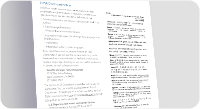 | 48 | ERISA Disclosure Notice UnityPoint Health does not discriminate, exclude, or treat people differently on the basis of race, color, national origin, age, disability, or sex. We provide the following for free: › Communication aids and services to people with disabilities, such as: – Sign language interpreters – Written information in other formats › Language services to people whose primary language is not English, such as: – Interpreters – Information written in other languages If you need these services, contact the Section 1557 Coordinator. If you believe that we have failed to provide these services or discriminated on the basis of race, color, national origin, age, disability, or sex, you can file a grievance in person, by mail or by phone with: Benefits Manager, Human Resources 1776 West Lakes Parkway West Des Moines, IA 50266 (515) 883-9662 The Section 1557 Coordinator is available to help you file a grievance. You can also file a complaint with the U.S. Department of Health and Human Services, Office for Civil Rights, electronically at https://ocrportal.hhs.gov/ocr/portal/ lobby.jsf, or by mail or phone at: U.S. Department of Health and Human Services 200 Independence Avenue, SW Room 509F HHH Building Washington, D.C. 20201 1-800-368-1019 | 1-800-537-7697 (TDD) Complaint forms are available at http://www.hhs.gov/ocr/office/file/index.html Vietnamese CHÚ Ý: Nếu bạn nói Tiếng Việt, có các dịch vụ hỗ trợ ngôn ngữ miễn phí dành cho bạn. Gọi số 1-515-574-6608. Arabic ﻣﻠﺣوظﺔ: إذا ﻛﻧت ﺗﺗﺣدث اذﻛر اﻟﻠﻐﺔ، ﻓﺈن ﺧدﻣﺎت اﻟﻣﺳﺎﻋدة اﻟﻠﻐوﯾﺔ ﺗﺗواﻓر ﻟك ﺑﺎﻟﻣﺟﺎن. اﺗﺻل ﺑرﻗم 1-515-574-6608 Chinese注意:如果您使用繁體中文,您可以免費獲得語 言援助服務。請致電 1-515-574-6608。 French ATTENTION : Si vous parlez français, des services d’aide linguistique vous sont proposés gratuitement. Appelez le 1-515-574-6608. German ACHTUNG: Wenn Sie Deutsch sprechen, stehen Ihnen kostenlos sprachliche Hilfsdienstleistungen zur Verfügung. Rufnummer: 1-515-574-6608. Gujarati !ુચના: જો તમે -ુજરાતી બોલતા હો, તો િન:5ુ6ક ભાષા સહાય સેવાઓ તમારા માટ? ઉપલBધ છે. ફોન કરો 1-515-574-6608. Hindi !यान द': य)द आप ,हंदी बोलते ह5 तो आपके िलए मु;त म' भाषा सहायता सेवाएं उपलAध ह5। 1-515-574-6608 पर कॉल कर'। Hmong LUS CEEV: Yog tias koj hais lus Hmoob, cov kev pab txog lus, muaj kev pab dawb rau koj. Hu rau 1-515-574-6608. Italian ATTENZIONE: In caso la lingua parlata sia l’italiano, sono disponibili servizi di assistenza linguistica gratuiti. Chiamare il numero 1-515-574-6608. Korean주의: 한국어를 사용하시는 경우, 언어 지원 서비스를 무료로 이용하실 수 있습니다. 1-515-574-6608 번으로 전화해 주십시오. Polish UWAGA: Jeżeli mówisz po polsku, możesz skorzystać z bezpłatnej pomocy językowej. Zadzwoń pod numer 1-515-574-6608. Russian ВНИМАНИЕ: Если вы говорите на русском языке, то вам доступны бесплатные услуги перевода. Звоните 1-515-574-6608. Spanish ATENCIÓN: si habla español, tiene a su disposición servicios gratuitos de asistencia lingüística. Llame al 1-515-574-6608. Tagalog PAUNAWA: Kung nagsasalita ka ng Tagalog, maaari kang gumamit ng mga serbisyo ng tulong sa wika nang walang bayad. Tumawag sa 1-515-574-6608. Urdu .اﮔر آپ اردو ﺑوﻟﺗﮯ ﮨﯾں، ﺗو آپ ﮐو زﺑﺎن ﮐﯽ ﻣدد ﮐﯽ ﺧدﻣﺎت ﺑردار: ﻣﻔت ﻣﯾں دﺳﺗﯾﺎب ﮨﯾں ۔ ﮐﺎل ﮐرﯾں1-515-574-6608 . Availability of Summary Health Information UnityPoint Health offers two medical plans. As required by Patient Protection and Affordable Care Act, your plan makes available a Summary of Benefits and Coverage (SBC) for each option. The SBCs can be found at the HR landing page on the Hub. You can also request a paper copy, free of charge, by contacting AskHR