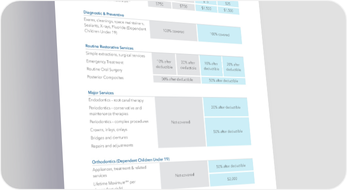 | 16 | Dental Insurance, continued BASIC PLAN PREMIER PLAN Delta PPO*** Delta Premier/ Out of Network Delta PPO*** Delta Premier/ Out of Network Deductible $25 $50 $15 $25 Individual Annual Maximum* $750 $750 $1,500 $1,500 Diagnostic & Preventive Exams, cleanings, space maintainers, Sealants, X-rays, Fluoride (Dependent Children Under 19) 100% covered 100% covered Routine Restorative Services Simple extractions, surgical services 10% after deductible 20% after deductible 10% after deductible 20% after deductible Emergency Treatment Routine Oral Surgery Posterior Composites 50% after deductible 50% after deductible Major Services Endodontics – root canal therapy Not covered 20% after deductible Periodontics – conservative and maintenance therapies Periodontics – complex procedures 50% after deductible Crowns, inlays, onlays Bridges and dentures Repairs and adjustments Orthodontics (Dependent Children Under 19) Appliances, treatment & related services Not covered 50% after deductible Lifetime Maximum** per dependent child $2,000 Dental Premium Cost – Per Pay Period Employee Only $5.89 $9.54 Employee + Child(ren) $13.20 $21.63 Employee + Spouse/DP $11.58 $19.05 Family $17.50 $28.85 *The Individual Annual Maximum is the maximum benefit each covered person is eligible to receive for certain covered services in 2024. **The Lifetime Maximum is the maximum benefit each covered person is eligible to receive for orthodontics in a lifetime. *** You will commonly pay less when seeing a Participating Delta Dental Dentist. For more information, please see the Dental SPD located on the HR Landing Page.