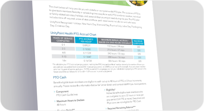 | 36 | Paid Time Off (PTO) The chart below will help provide you with details on our system-wide PTO plan. The purpose of PTO is to give team members flexibility in scheduling time away from work. PTO combines vacation, individual or family related sick days, holidays, and personal days you might need during the year. The PTO plan includes time off required under all state and local paid leave laws to include sick and safe leave. UnityPoint Recognized Holidays: New Year’s Day, Memorial Day, Fourth of July, Labor Day, Thanksgiving Day, Christmas Day. UnityPoint Health PTO Accrual Chart YEARS OF SERVICE COMPLETED PTO ACCRUED PER HOUR* MAXIMUM ANNUAL ACCRUAL* (BASED ON 2080 HOURS ANNUALLY) MAXIMUM CARRYOVER 0-1 0.09231 192 hours / 24 days 320 2-3 0.10385 216 hours / 27 days 320 4-8 0.11539 240 hours / 30 days 320 9-13 0.13847 288 hours / 36 days 320 14+ 0.16154 336 hours / 42 days 320 * To calculate your PTO accrual per pay period, multiply the “PTO Accrued per Hour” number above by the number of hours you are paid per pay period (not to exceed 80 hours per pay period or 2080 hours annually). For example, if you are a team member who has 16 years of service and are a .75 FTE or work 60 hours per pay period, your calculation to project your PTO accrual in the future would be as follows: 0.1615 x 60 = 9.69 accrued hours in a pay period. * In order to receive a PTO Cash election, you must be an active, benefit eligible team member at the time of the payout. Executives and Physicians are not eligible for PTO Cash. ** PTO cash elections can only be made within the election period. You will not be able to make changes, including cancellation, to your PTO cash election(s) outside of the election period. *** While there is no required remaining balance, if you elect to cash out more hours than you have in your bank at the time of the payout dates, you will not receive the full elected cash-out amount. Instead, your payout will be reduced to the number hours in your bank at the time of the payout. PTO Cash Benefit eligible team members are eligible to cash out up to 40 hours of PTO, in 5-hour increments, annually. Please review the information below for further details and contact AskHR if you have questions. › Component PTO Cash Guidelines › Maximum Hours to Declare 40 hours › Election Period** During Open Enrollment › Payout Dates Announced during the annual open enrollment period › Eligibility* Active, benefit eligible team members who are budgeted to work 32 hours or more per pay period (0.4 FTE or more). Executives and Physicians are not eligible for PTO Cash. › Required Remaining Balance*** There is no requirement to have any remaining balance in your PTO account after the cash out occurs.