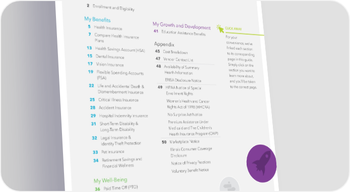 Table of Contents 1 Hello 2 Enrollment and Eligibility My Benefits 5 Health Insurance 7 Compare Health Insurance Plans 13 Health Savings Account (HSA) 15 Dental Insurance 17 Vision Insurance 19 Flexible Spending Accounts (FSA) 22 Life and Accidental Death & Dismemberment Insurance 25 Critical Illness Insurance 28 Accident Insurance 29 Hospital Indemnity Insurance 31 Short-Term Disability & Long-Term Disability 32 Legal Insurance & Identity Theft Protection 33 Pet Insurance 34 Retirement Savings and Financial Wellness My Well-Being 36 Paid Time Off (PTO) 37 Parental Leave & Adoption Assistance 38 Team Member Discounts and Earned Wage Access 39 OnPoint for Health CLICK AWAY For your convenience, we’ve linked each section to its corresponding page in this guide. Simply click on the section you want to learn more about, and you’ll be taken to the correct page. My Growth and Development 41 Education Assistance Benefits Appendix 45 Cost Breakdown 47 Vendor Contact List 48 Availability of Summary Health Information ERISA Disclosure Notice 49 HIPAA Notice of Special Enrollment Rights Women’s Health and Cancer Rights Act of 1998 (WHCRA) No Surprise Act Notice Premium Assistance Under Medicaid and The Children’s Health Insurance Program (CHIP) 50 Marketplace Notice Illinois Consumer Coverage Disclosure Notice of Privacy Practices Voluntary Benefit Notice