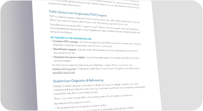| 42 | Education Assistance, continued Work Commitment A Team Member who voluntarily terminates employment or is terminated for cause within 12 months of receiving education assistance through Traditional Reimbursement will be required to refund UnityPoint Health 100% of the payments received within that time period on a pro-rated basis from the time of last payment and date of termination. Public Service Loan Forgiveness (PSLF) Support PSLF is a federal program created for those in public service jobs, offering the opportunity to have your federal loan balances forgiven after 10 years and 120 qualifying payments. All tax free! Team Members can receive PSLF support through Fidelity’s Summer program aimed at streamlining and automating the process while reducing stress with resources that may help increase financial well- being and confidence. KEY FEATURES OF THE PROGRAM INCLUDE: › Complete PSLF coverage – Summer manages the entire PSLF process for borrowers from checking eligibility to employer coordination and online form submission. › Recertification support – Summer works with borrowers and their employers to ensure all PSLF requirements are met. › Protection from server mistakes – Summer has deep experience navigating rejections from loan servicer mistakes. For help from an expert to determine your eligibility or support filling in your forms, visit fidelity.com/forgiveness. Employment certification forms ready for completion should be sent to [email protected]. Student Loan Origination & Refinancing Fidelity’s Credible program is one way to find options to pay for college. Credible is an online marketplace that provides borrowers looking for private student loads with competitive, personalized, prequalified rates from up to 8 vetted lenders. There is no cost to request offers, and checking rates will not impact your credit score. Key features of the program include: › Personalized rates, not ranges from multiple lenders › Ability to comparison shop across lenders to find the best solution for your situation › No hidden fees, original fees, or prepayment penalties › Simple online process that keeps your data confidential. To access Credible log into the Fidelity portal at netbenefits.com.