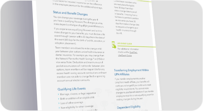 | 3 | Domestic Partner Imputed Income If you choose to add your domestic partner to your medical and/or dental coverage, you will be responsible for imputed income tax on the difference in the employer premium for the additional coverage. Status and Benefit Changes You can change your coverage during the year if you have a qualifying life event. The changes you may make depend on the type of qualifying event that occurs. If you experience a qualifying life event and wish to make changes to your benefits, you must declare a life event through Lawson within 30 days from the date of the event (60 days for the birth of a child, adoption, or adoption placement). Team members are allowed to make changes mid- year between plan options under health insurance or dental insurance. For example you may change from the Network Plan to the Health Savings Plan (HSA) or vice versa. Note: Deductible and maximum out of pocket accumulators will not transfer between plan options, team members will be responsible for any excess health saving account contributions and team members are not able to change flexible spending account annual election amounts. Qualifying Life Events › Marriage, divorce, or legal separation › Birth or addition of an eligible child › Loss of other coverage › New eligibility for other coverage › Qualified medical child support order › Status changes › Commencement or return from an unpaid leave of absence STATUS CHANGES Current team members who are newly benefit eligible have 30 days from their status change date to enroll in benefits. If moving from a full-time to part-time position or vice versa you have 30 days from status change date to request a change to your health insurance through AskHR. Transferring Employment Within UPH Affiliates If you transfer employment to another UnityPoint Health affiliate, your benefits will continue unchanged if you continue to meet eligibility requirements. You cannot make changes to your benefit elections if you transfer employment as this is not a qualifying event for making changes during the year. Dependent Eligibility Eligibility for your dependent begins or ends with: › Change in residence or place of work resulting in change in health insurance availability › Death of spouse/domestic partner or child LIFE EVENT GUIDE For additional information check out the Qualified Life Event Guide