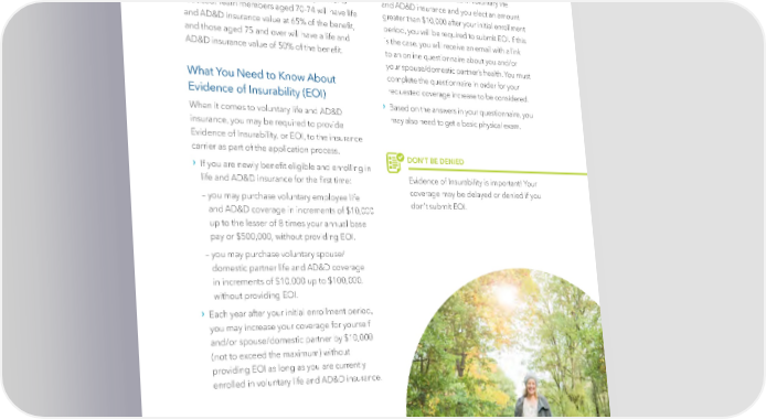 | 23 | Amount Limit Due to Age If you are age 70 and over, the life and AD&D insurance benefit amount you are eligible for is reduced. Team members aged 70-74 will have life and AD&D insurance value at 65% of the benefit, and those aged 75 and over will have a life and AD&D insurance value of 50% of the benefit. What You Need to Know About Evidence of Insurability (EOI) When it comes to voluntary life and AD&D insurance, you may be required to provide Evidence of Insurability, or EOI, to the insurance carrier as part of the application process. › If you are newly benefit eligible and enrolling in life and AD&D insurance for the first time: – you may purchase voluntary employee life and AD&D coverage in increments of $10,000 up to the lesser of 8 times your annual base pay or $500,000, without providing EOI. – you may purchase voluntary spouse/ domestic partner life and AD&D coverage in increments of $10,000 up to $100,000, without providing EOI. › Each year after your initial enrollment period, you may increase your coverage for yourself and/or spouse/domestic partner by $10,000 (not to exceed the maximum) without providing EOI as long as you are currently enrolled in voluntary life and AD&D insurance. Life AD&D Insurance EOI Process › If you are currently enrolled in voluntary life and AD&D insurance and you elect an amount greater than $10,000 after your initial enrollment period, you will be required to submit EOI. If this is the case, you will receive an email with a link to an online questionnaire about you and/or your spouse/domestic partner’s health. You must complete the questionnaire in order for your requested coverage increase to be considered. › Based on the answers in your questionnaire, you may also need to get a basic physical exam. Life and Accidental Death & Dismemberment Insurance, continued DON’T BE DENIED Evidence of Insurability is important! Your coverage may be delayed or denied if you don’t submit EOI.