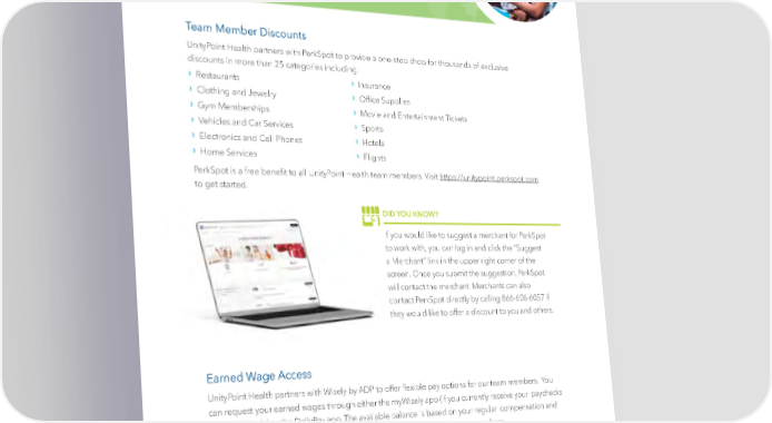 | 38 | Team Member Discounts Team Member Discounts UnityPoint Health partners with PerkSpot to provide a one-stop shop for thousands of exclusive discounts in more than 25 categories including: › Restaurants › Clothing and Jewelry › Gym Memberships › Vehicles and Car Services › Electronics and Cell Phones › Home Services › Insurance › Office Supplies › Movie and Entertainment Tickets › Sports › Hotels › Flights PerkSpot is a free benefit to all UnityPoint Health team members. Visit https://unitypoint.perkspot.com to get started. DID YOU KNOW? If you would like to suggest a merchant for PerkSpot to work with, you can log in and click the “Suggest a Merchant” link in the upper right corner of the screen. Once you submit the suggestion, PerkSpot will contact the merchant. Merchants can also contact PerkSpot directly by calling 866-606-6057 if they would like to offer a discount to you and others. Earned Wage Access UnityPoint Health partners with Wisely by ADP to offer flexible pay options for our team members. You can request your earned wages through either the myWisely app (if you currently receive your paychecks through Wisely) or the DailyPay app. The available balance is based on your regular compensation and hours (minus any withholdings) worked to date during a pay period. Learn more here.