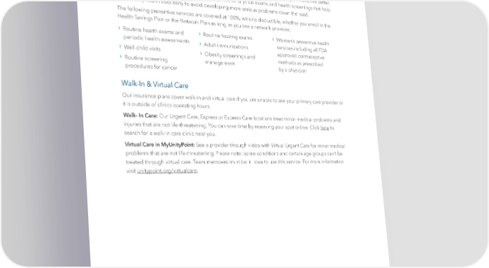 | 6 | Health Insurance, continued Preventive Care Benefits Working in health care, we know how adopting a healthy lifestyle can help us stay well and live better. Therefore, it is important that you periodically receive physical exams and health screenings that help you identify health risks early to avoid developing more serious problems down the road. The following preventive services are covered at 100%, with no deductible, whether you enroll in the Health Savings Plan or the Network Plan as long as you see a network provider: › Routine health exams and periodic health assessments › Well-child visits › Routine screening procedures for cancer › Routine hearing exams › Adult immunizations › Obesity screenings and management › Women’s preventive health services including all FDA approved contraceptive methods as prescribed by a physician Walk-In & Virtual Care Our insurance plans cover walk-in and virtual care if you are unable to see your primary care provider or it is outside of clinics operating hours. Walk- In Care: Our Urgent Care, Express or Express Care locations treat minor medical problems and injuries that are not life-threatening. You can save time by reserving your spot online. Click here to search for a walk-in care clinic near you. Virtual Care in MyUnityPoint: See a provider through video with Virtual Urgent Care for minor medical problems that are not life-threatening. Please note: some conditions and certain age groups can’t be treated through virtual care. Team members must be in Iowa to use this service. For more information visit unitypoint.org/virtualcare.